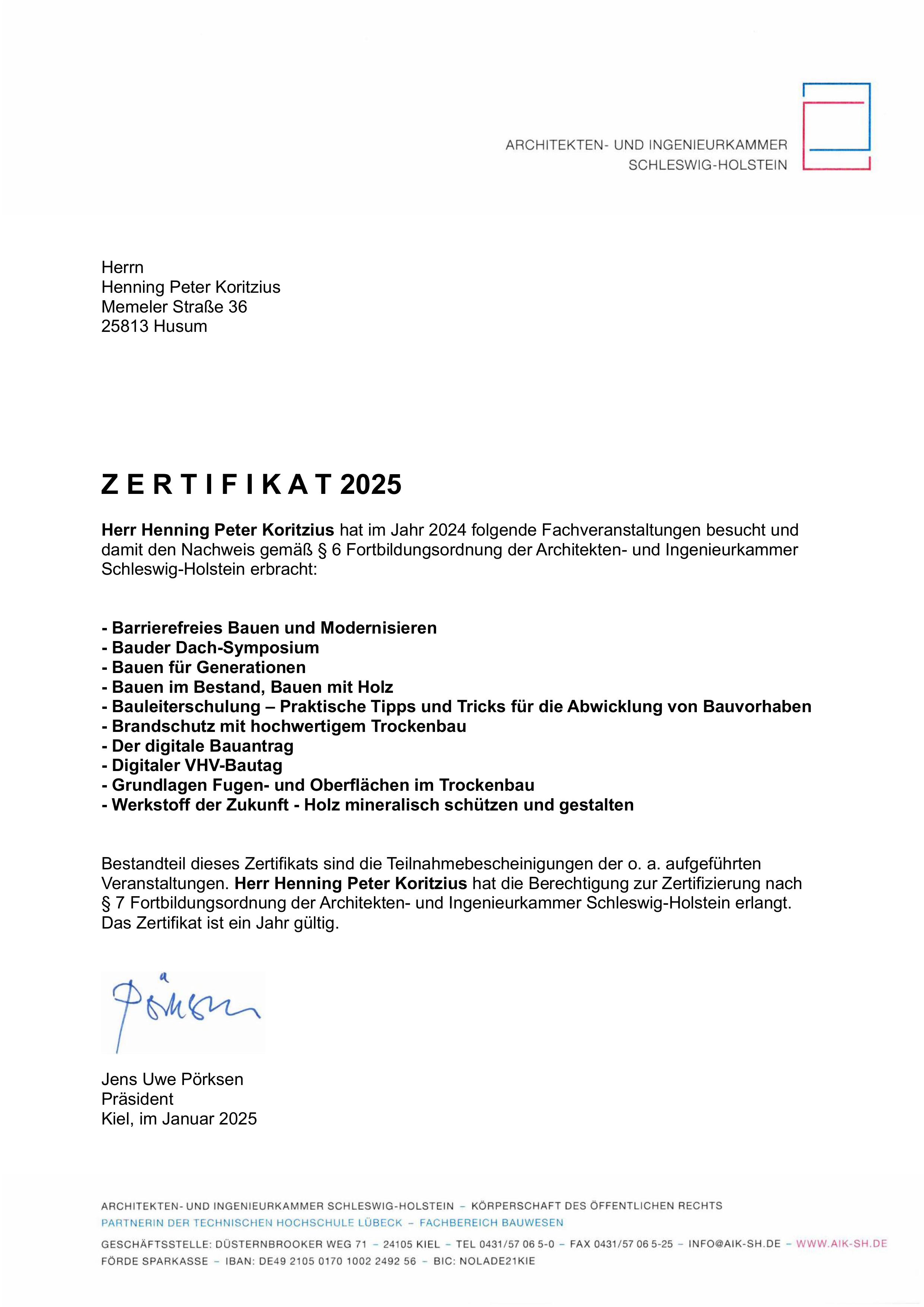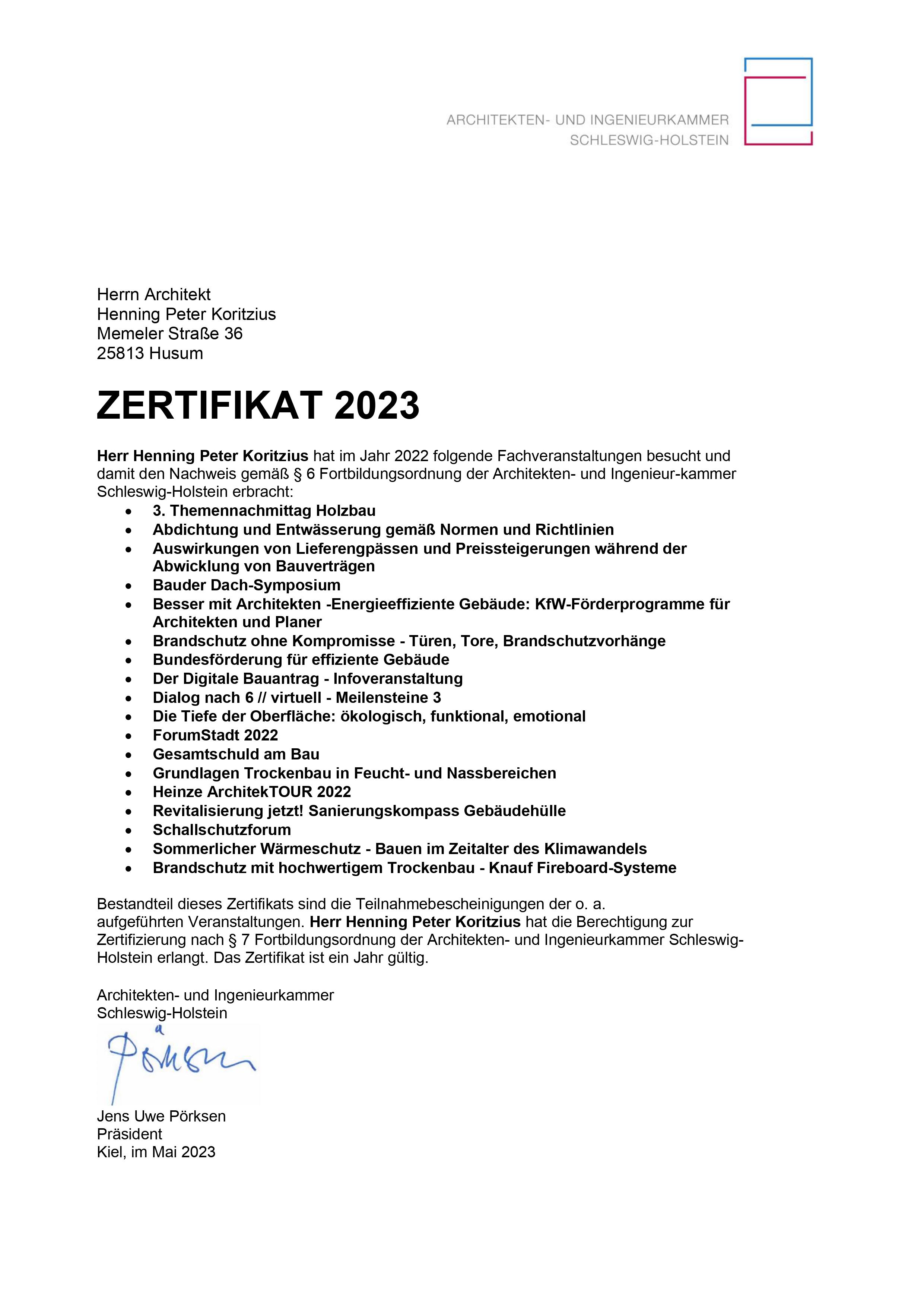 Dipl. Ing. Henning Koritzius, Husum, ist seit über 2 Jahrzehnten in der Architektenliste der Architekten- und Ingenieurkammer Schleswig-Holstein geführt: Freischaffender Hochbauarchitekt, Mitgliedsnummer 4702.