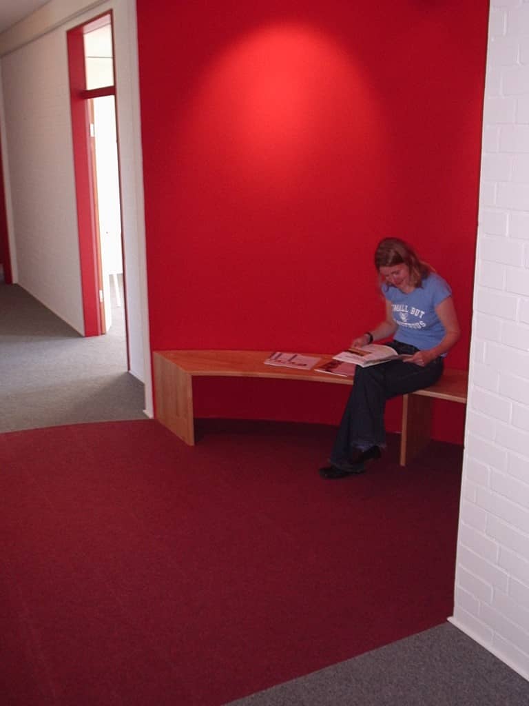 In der Mitte des Flures errichteten wir zudem eine "Warteinsel" vor dem großen Besprechungsraum. An der gebogenen Wand mit gemütlicher Sitzbank, Snacks und Lektüre können Mandanten verweilen und sich angenommen fühlen.