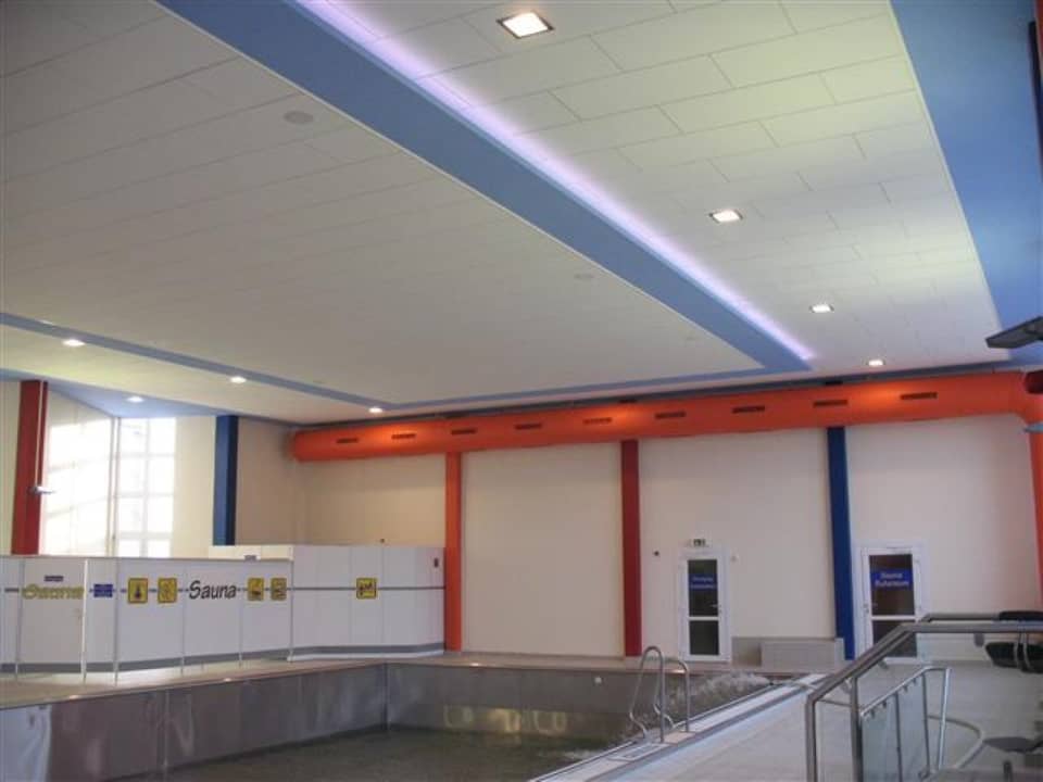 Die alte, schadhafte Holzdecke des Schwimmbades auf Nordstrand wurde ausgebaut und stattdessen eine zusätzliche Dämmung mit Dampfsperre im Deckenraum eingebracht und unterseitig eine Akustikdecke für verbesserten Schallschutz eingebracht. Durch die Abhängung im Bereich des Beckenteils entstand zusätzlich eine Lichtvoute, über die verschiedene Farbvariationen eines LED-Bandes eingestellt werden können. Die gesamte Deckensanierung nahm nur einen Monat in Anspruch!