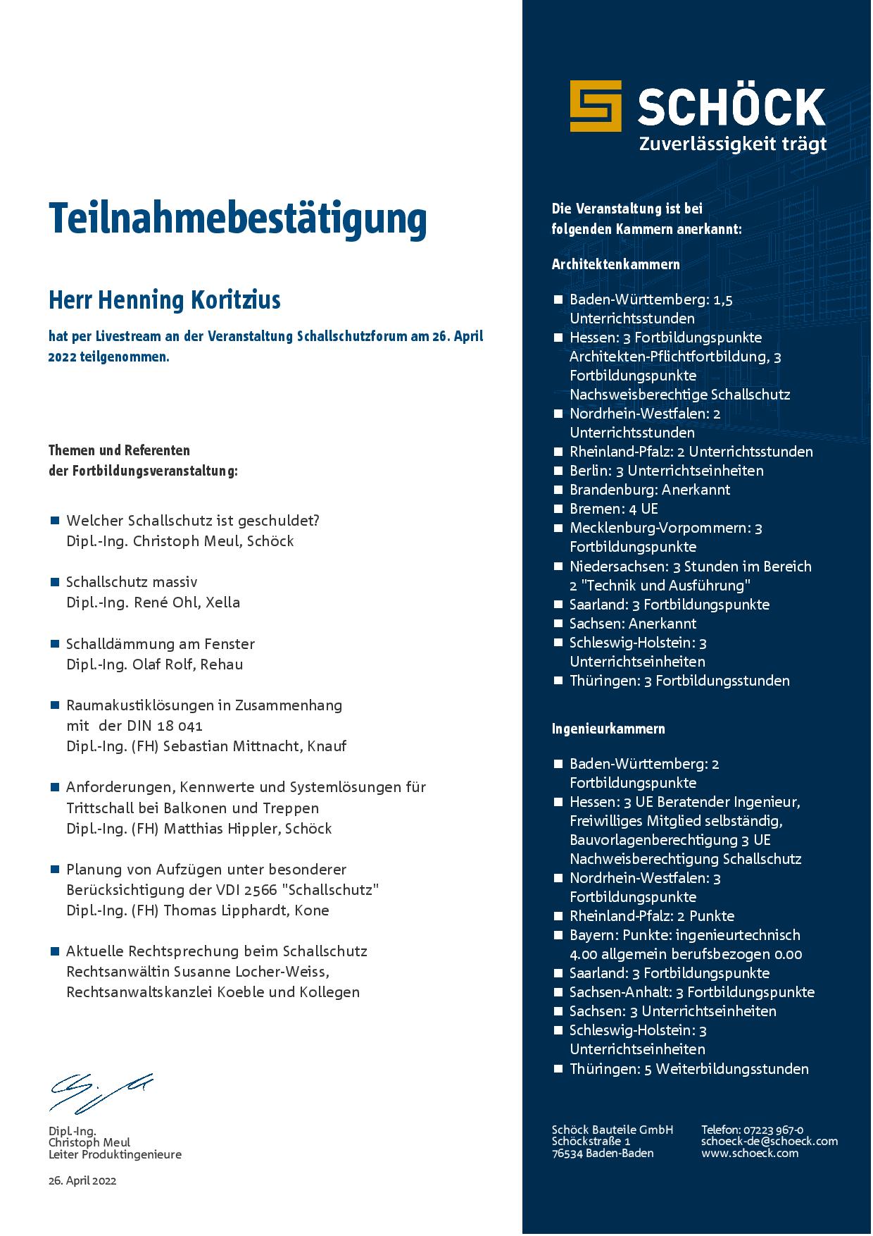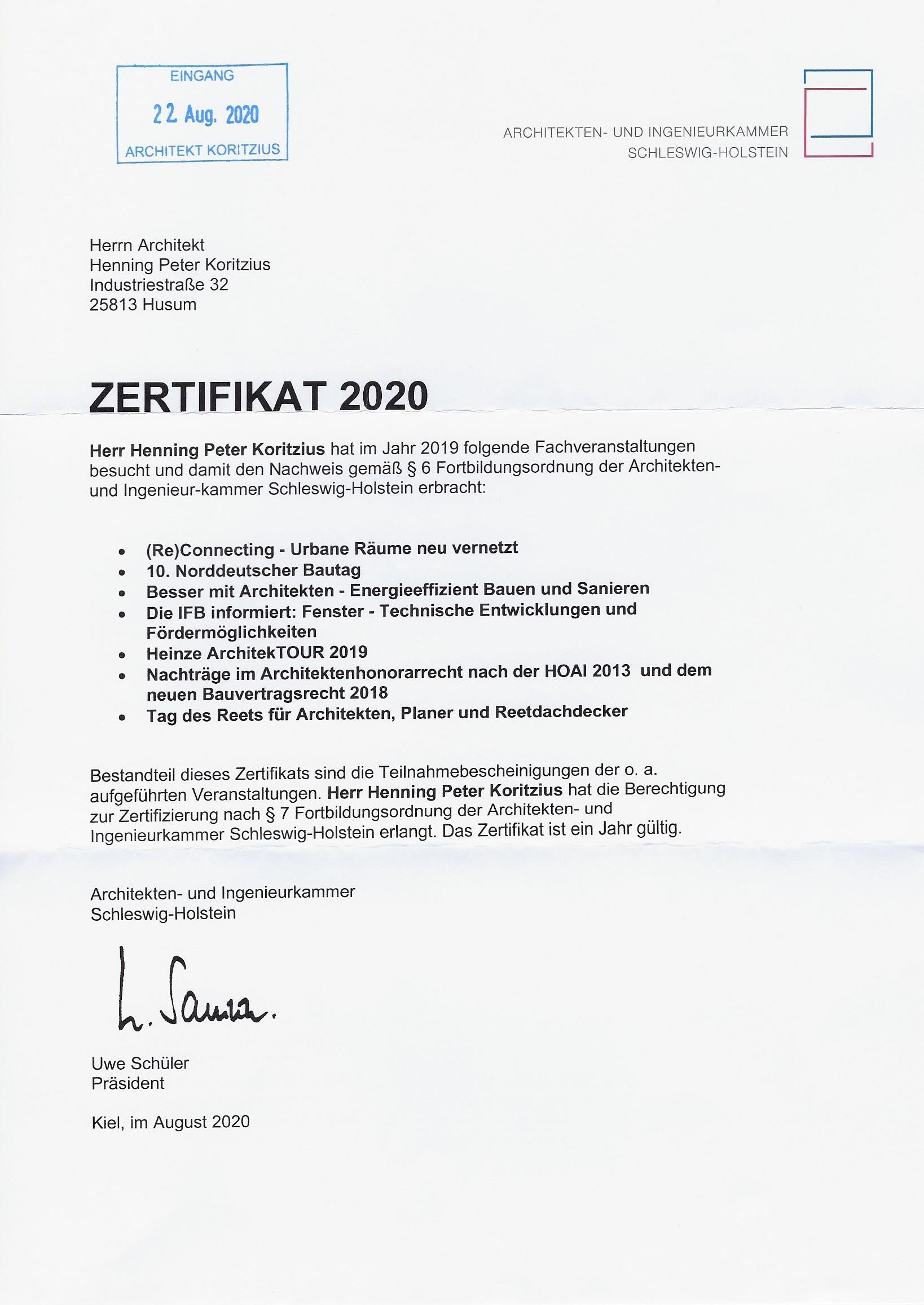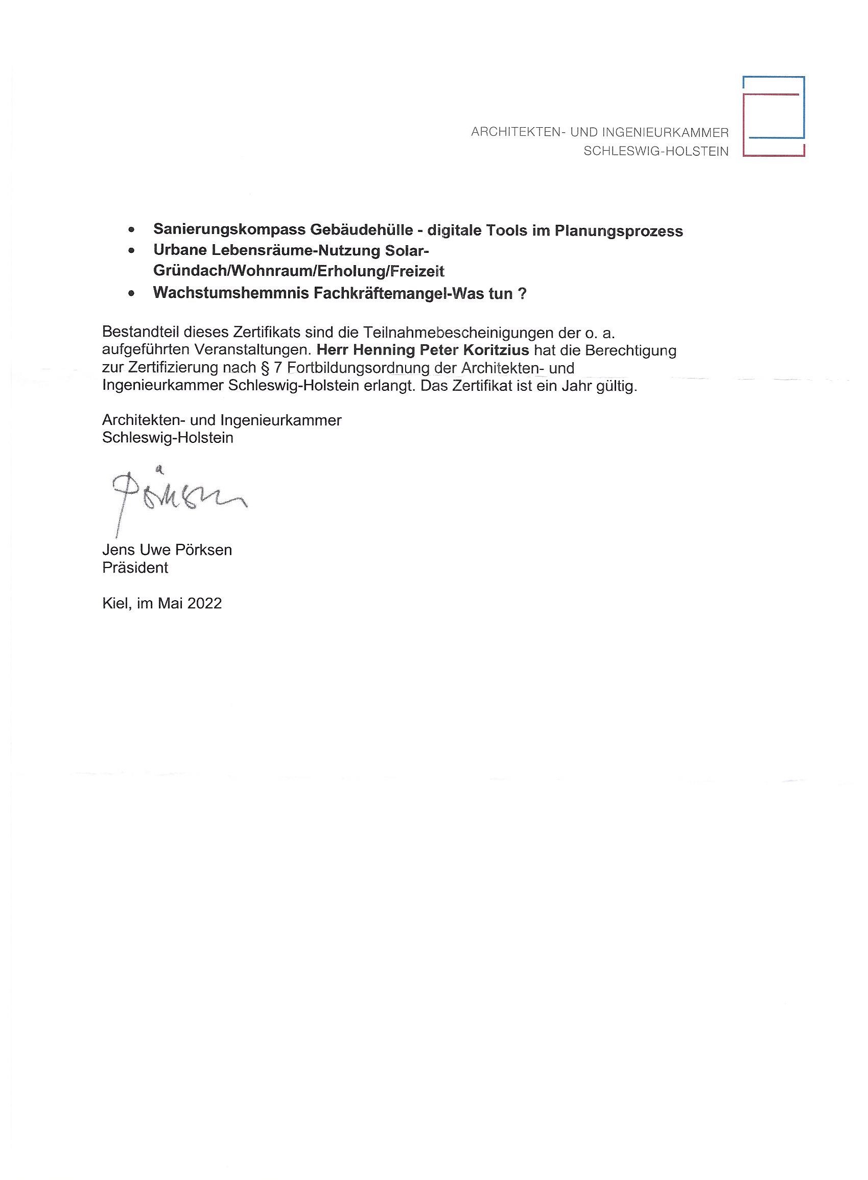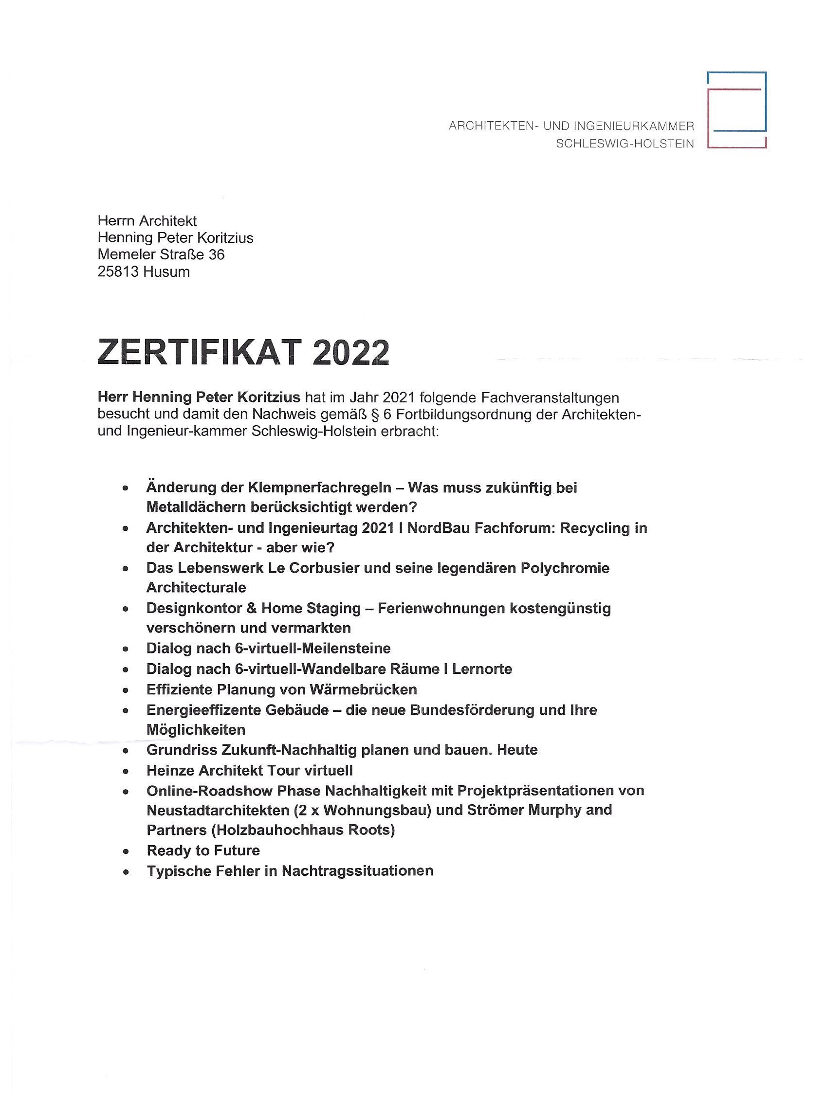 Dipl. Ing. Henning Koritzius, Husum, ist seit über 2 Jahrzehnten in der Architektenliste der Architekten- und Ingenieurkammer Schleswig-Holstein geführt: Freischaffender Hochbauarchitekt, Mitgliedsnummer 4702.