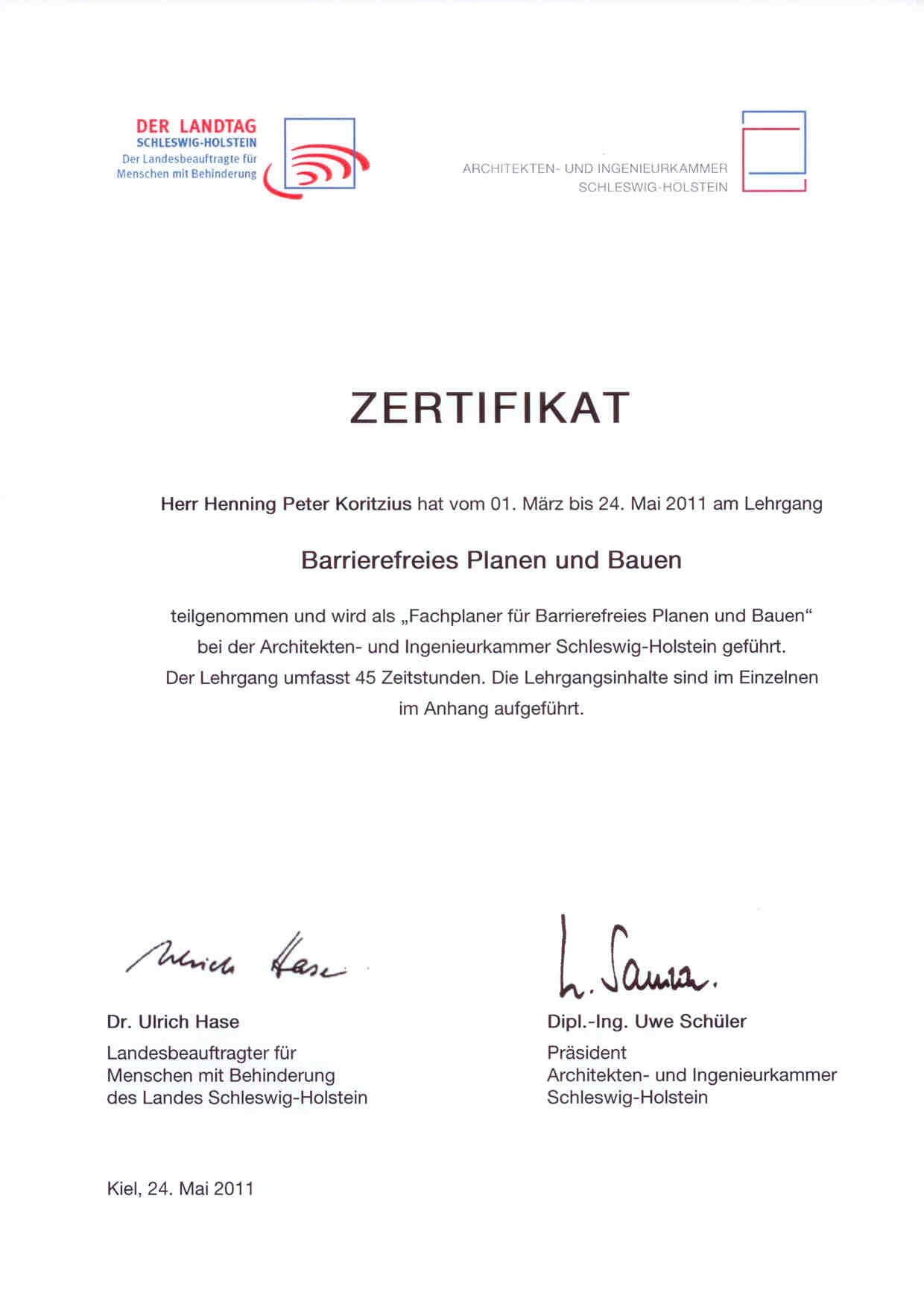 Ein Schwerpunkt unserer Tätigkeit ist zudem der barrierefreie Um- und Neubau von Gebäuden. Herr Dipl. Ing. Henning Koritzius ist zertifizierter Planer für Barrierefreies Planen und Bauen (Architektenkammer Schleswig-Holstein).