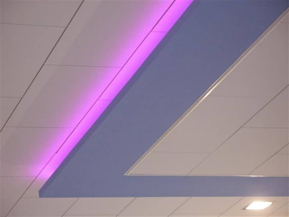 Die alte, schadhafte Holzdecke des Schwimmbades auf Nordstrand wurde ausgebaut und stattdessen eine zusätzliche Dämmung mit Dampfsperre im Deckenraum eingebracht und unterseitig eine Akustikdecke für verbesserten Schallschutz eingebracht. Durch die Abhängung im Bereich des Beckenteils entstand zusätzlich eine Lichtvoute, über die verschiedene Farbvariationen eines LED-Bandes eingestellt werden können. Die gesamte Deckensanierung nahm nur einen Monat in Anspruch!